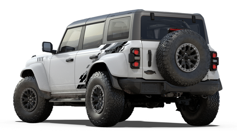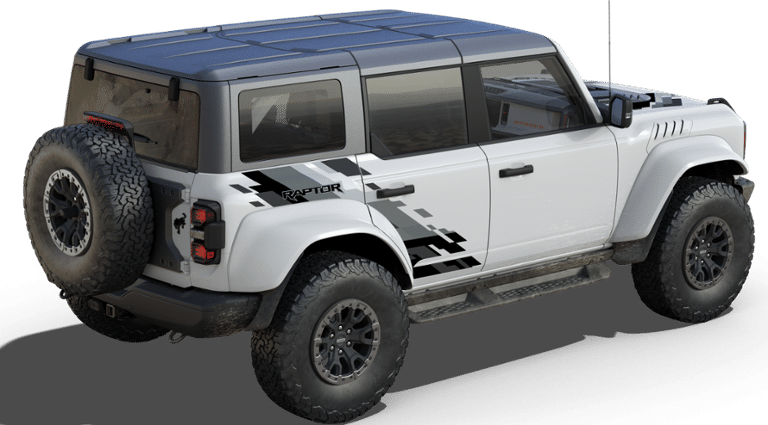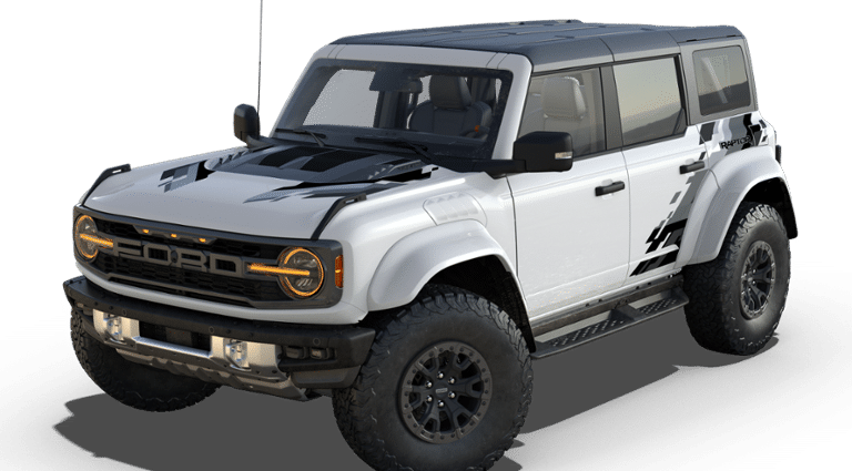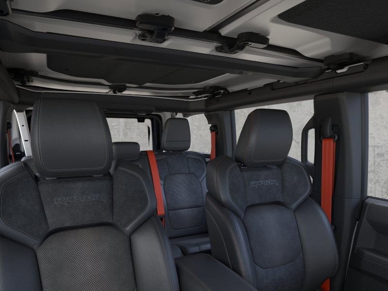 - Experience the ultimate off-road performance and rugged capability in this 2025 Ford Bronco Raptor 4-Door 4x4, finished in striking Oxford White. Built to conquer any terrain, the Bronco Raptor is powered by a 3.0L EcoBoost V6 engine paired with a 10-speed automatic transmission, delivering impressive strength and responsiveness wherever your adventure leads. Designed for the serious off-road enthusiast, this Bronco features HOSS 4.0 suspension with FOX Live Valve dampers, front and rear locking differentials, and 37-inch all-terrain tires mounted on 17-inch black forged beadlock-capable wheels. Heavy-duty metal bash plates, modular steel bumpers, and tow hooks on both ends ensure youre ready for even the toughest trails. Inside, the cabin blends rugged durability with refined comfort. Enjoy Onyx leather-trimmed and suede seats with Code Orange seat belts, a sport leather steering wheel with paddle shifters, and advanced technology like a 12-inch LCD touchscreen, digital instrument cluster, and 360-degree camera system. The Lux Package enhances every drive with smart connectivity and convenience, while features like FordPass Connect, Terrain Management System with G.O.A.T. Modes, and front stabilizer bar disconnect keep you in control on and off the road. Completing the look is a black-painted hard top with a sound-deadening headliner and bold Raptor graphics, giving this Bronco an unmistakable presence. Powerful, capable, and built to thrill the 2025 Ford Bronco Raptor is the ultimate combination of performance engineering and iconic design.