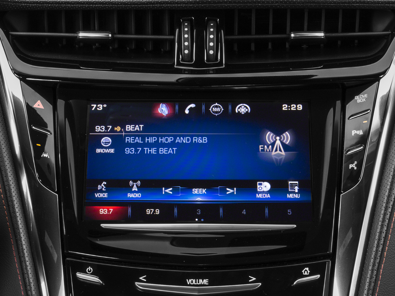 - Cadillac CUE Information and Media Control System with Embedded Navigation AM/FM stereo with embedded navigation, 8" color information display, three USB ports, auxiliary input jack, Natural Voice Recognition and Phone Integration for Apple CarPlay capability for compatible phone