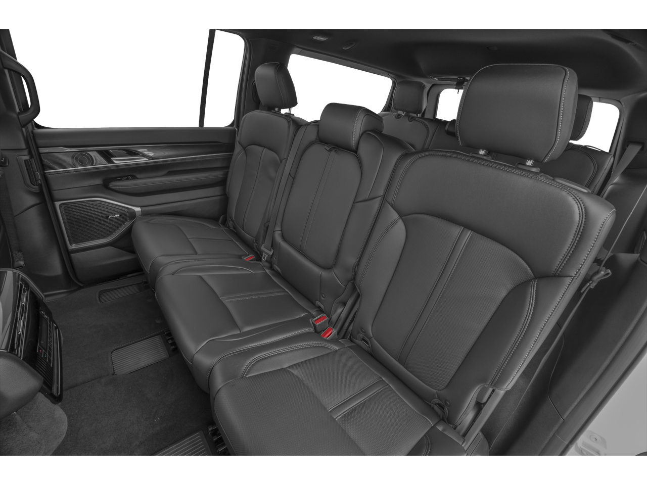 Series II interior: McEvoy leather seating, heated and ventilated fronts, heated second-row captain's chairs, tri-zone climate, and Amazon Fire TV rear entertainment on a 10.25-inch screen for rear passengers. The 10.25-inch Uconnect 5 up front adds wireless CarPlay, Android Auto, and a 360-degree surround view camera. Alpine 10-speaker audio. Adaptive cruise with stop-and-go.